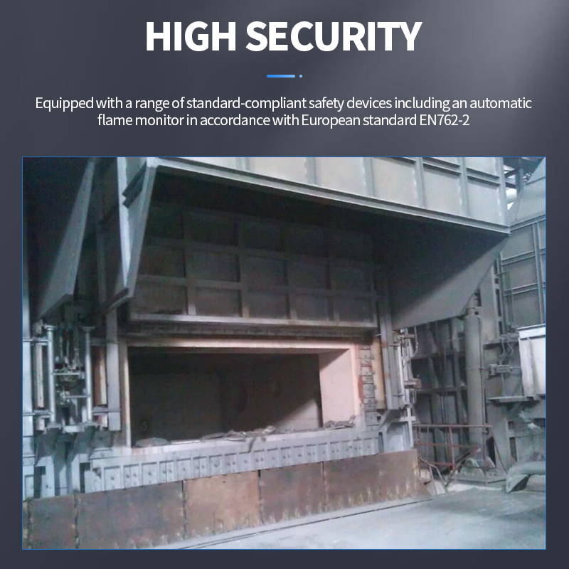 The combustion system is designed and configured in accordance with the European standard DIN-EN746 and the requirements of the National Fire Protection Association (NFPA) of the United States of America for gas furnaces and kilns, and is equipped with a series of standard-compliant safety devices such as automatic flame monitors in accordance with the European standard EN762-2, manual safety quick shut-off valves, low-pressure alarm detectors, automatic discharge devices, electromagnetic discharge devices and other safety devices, and the procedures are strictly controlled according to the standards for control, such as leakage detection, blowing, ignition, flame monitoring, etc., to ensure the safety of the system in the process of use. In addition to the above safety devices, the gas supply pipeline is equipped with solenoid valves, regulators, pressure switches, pressure gauges, gas filters, pressure stabilisation valves, orifice plate flow meters, electric actuators and corresponding connectors, etc., which are necessary for the system.