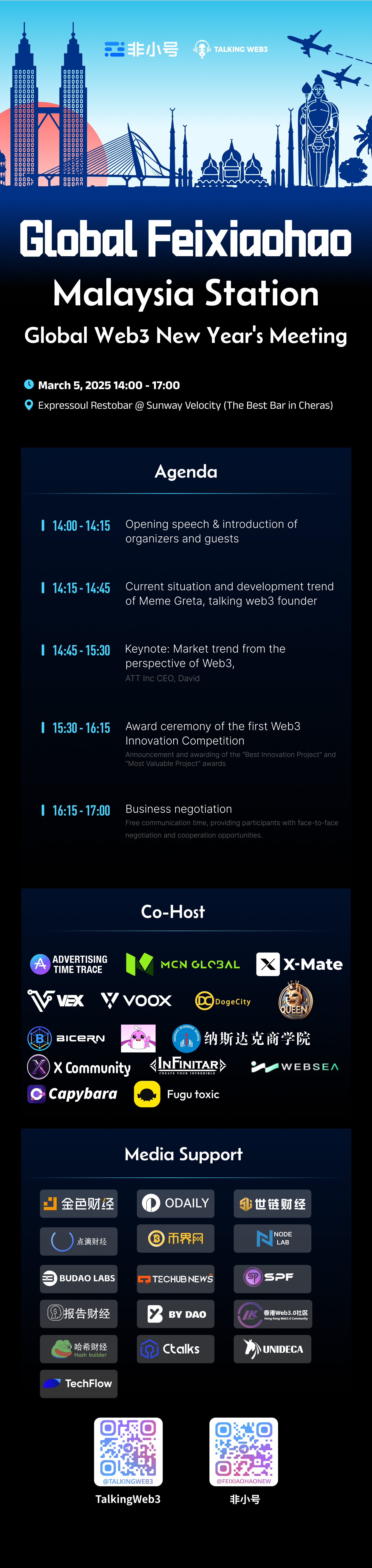 On March 5, 2025, the Feixiaohao Global Tour | 2025 Web3 New Year Meetup will be grandly held at Sunway Velocity in Malaysia! This event, co-hosted by Feixiaohao, Talking Web3, and Nasdaq Business School, will focus on global Web3 development trends, bringing together industry leaders, top projects, investment institutions, and community representatives to explore the latest opportunities and challenges in popular sectors such as AI + Blockchain, RWA (Real World Assets) digitization, Meme economy, GameFi, and DeFi.