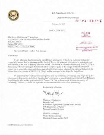 A filing from the US Department of Justice to the US District Court for the Northern Mariana Islands describes a plea deal regarding Julian Assange