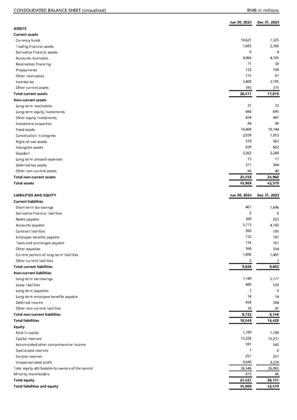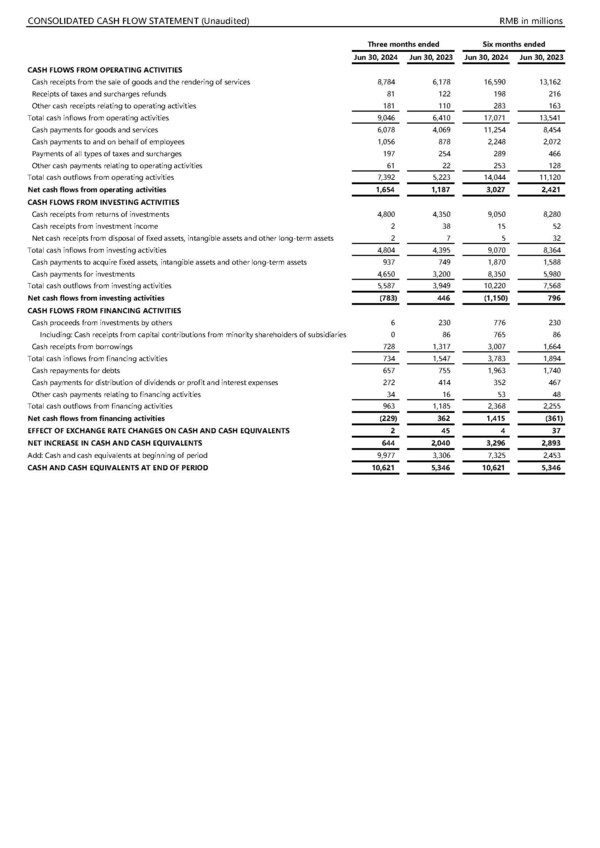 Generated RMB 3.03 billion cash from operations. With net capex investments of RMB 1.87 billion,free cash flow for the first half of 2024 was RMB 1.16 billion.
