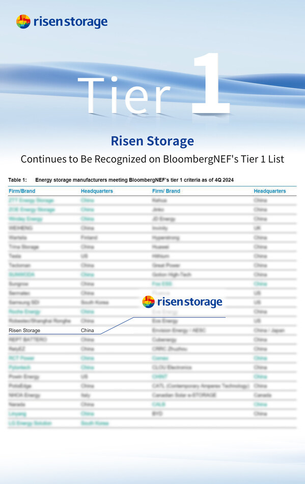 NINGBO,China,Oct. 25,2024 -- On October 23,2024,BloombergNEF (BNEF) released its Q4 2024 Global Tier 1 Energy Storage Manufacturers list,where Risen Energy Storage has once again been recognized as a Tier 1 global energy storage manufacturer. This distinction highlights Risen's commitment to delivering superior products,exceptional project performance,and building a trusted global brand.