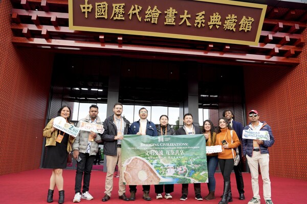 International influencers take a group photo at the Liangzhu Museum of A Comprehensive Collection of Ancient Chinese Paintings. [Photo/chinadaily.com.cn]