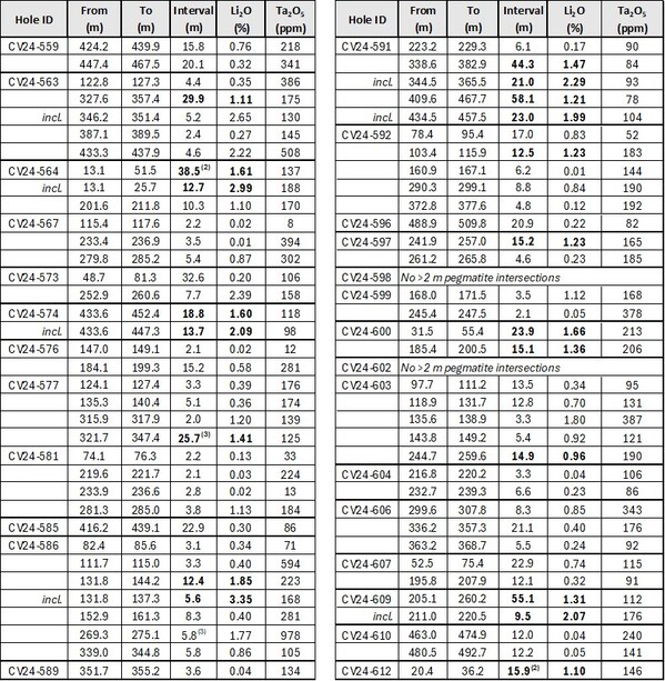 44.3 m at 1.47% Li2O and 58.1 m at 1.21% Li2O (CV24-591).