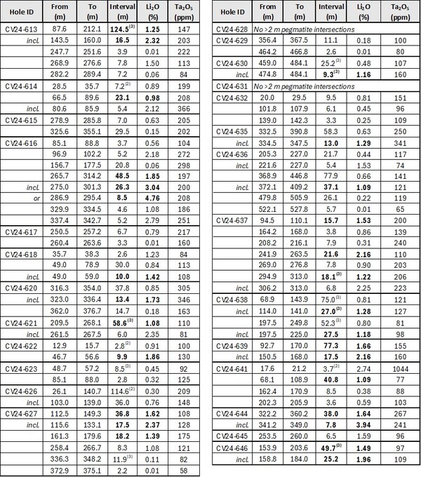 124.5 m at 1.25% Li2O,including 16.5 m at 2.32% Li2O (CV24-613).