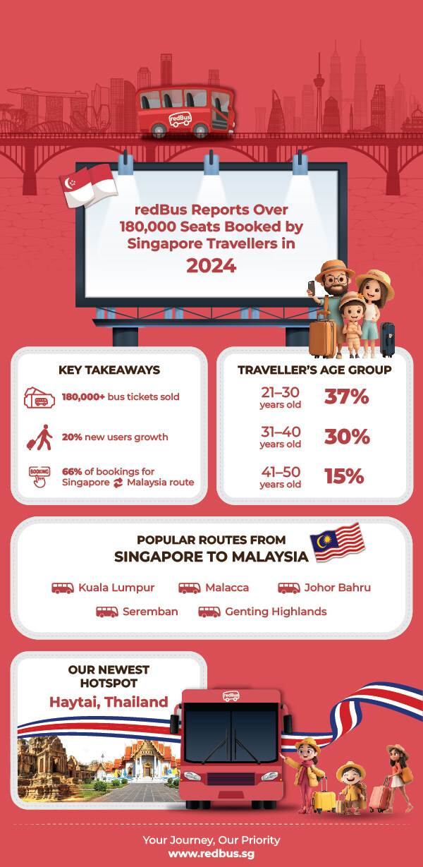 SINGAPORE,Jan. 8,2025 -- The appetite for cross-border travel is on the rise asSingaporeans increasingly turn to buses as their preferred mode of transport. redBus,the world's largest bus ticketing platform,has revealed key insights into this trend,reporting that over 180,000 bus seats were booked by Singapore-based travellers in 2024. This marks a significant uptick in demand for cost-effective,more sustainable travel options.