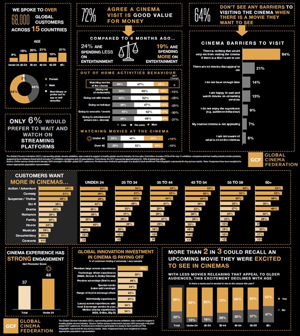 Jane Hastings,GCF Chairperson,commented"One of the goals for the GCF is to ensure global customer insights are shared with the film community so we can collectively better respond to customer demand. The industry often talks about how to drive frequency to the cinema and the answer is clear; releasing more films in cinemas that customers want to see drives frequency. Our customers are telling us that they have no barriers to going to the cinema when there is a movie they want to see. There is a great opportunity to meet this demand so attendance and frequency grow.