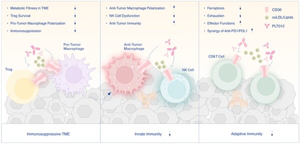 PLT012,is a humanized anti-CD36 antibody with a dual mechanism of action (MOA). It simultaneously inhibits immunosuppressive cell populations and enhances effector T cell function. Preclinical studies as a monotherapy have demonstrated its efficacy in both immune-hot and immune-cold tumor models,with a significant increase in GzmB-expressing CD8+ T cells and reductions in intratumoral Tregs and pro-tumorigenic macrophages. Additionally,PLT012 reshapes the exhaustion profile of cytotoxic CD8+ T cells by expanding both progenitor exhausted (Texprog) and terminally-exhausted (Texterm) populations with rejuvenated effector functions,leading to enhanced tumoricidal immunity. These findings suggest that PLT012,functioning as a metabolic regulator,may provide therapeutic benefits in cancer treatment,either as a monotherapy or in combination with immune checkpoint inhibitors such as PD-1 or PD-L1 inhibitors. Other than oncology,the unique MOA as a metabolic regulator also shows the potential of reprogramming the metabolic environment with associated benefits,e.g. liver functional improvement,thus laying the groundwork for targeting a broader spectrum of metabolic and immunological diseases.