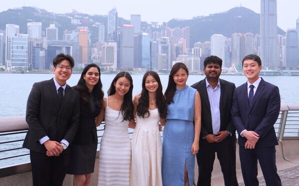 The winning SMU team at the 2025 Vis (East) moot held in Hong Kong. (L-R) Jonathan Teo,Aishwarya Salkade,Adele Ling,Evangeline Han,Samantha Loh; with coaches Suryanarayanan Jayakumar and Tan Jun Hong [Photo credit: SMU]