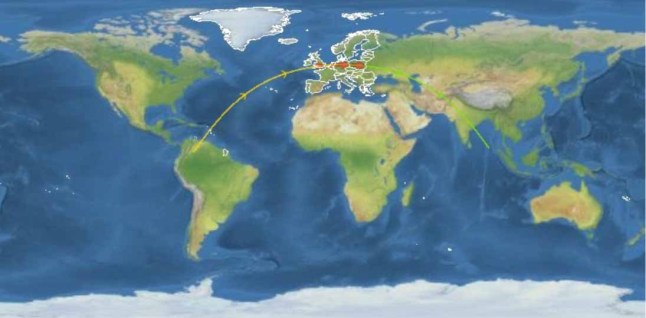 The yellow line shows the spacecraft’s trajectory as it came down,with areas marked in red were potential land sites the spacecraft could have crashed to (Picture: EU SST)