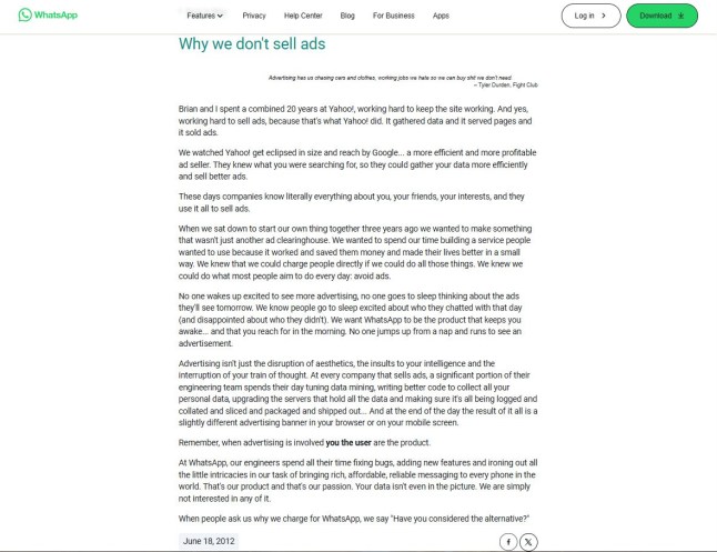 ‘We know people go to sleep excited about who they chatted with that day (and disappointed about who they didn’t). We want WhatsApp to be the product that keeps you awake… and that you reach for in the morning. No one jumps up from a nap and runs to see an advertisement.