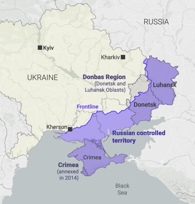The purple areas of Ukraine are currently controlled by Russia,and the hatched areas are land Russia wants Ukraine to cede in order to consider a ceasefire (Picture: Metro Graphics)