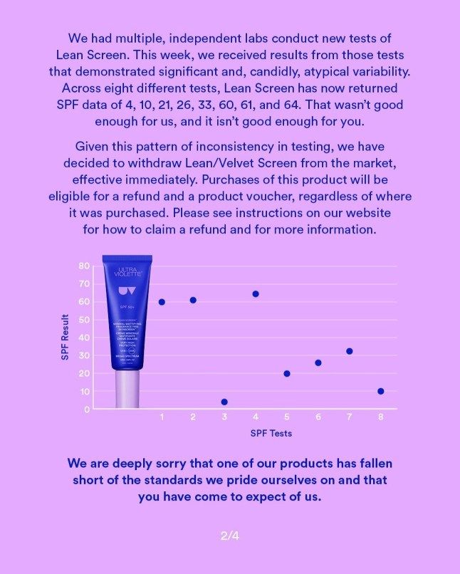 While Ultra Violette at first argued Lean Screen met its claims,it later announced the product would be recalled after it returned inconsistent results across eight different sets of lab testing.