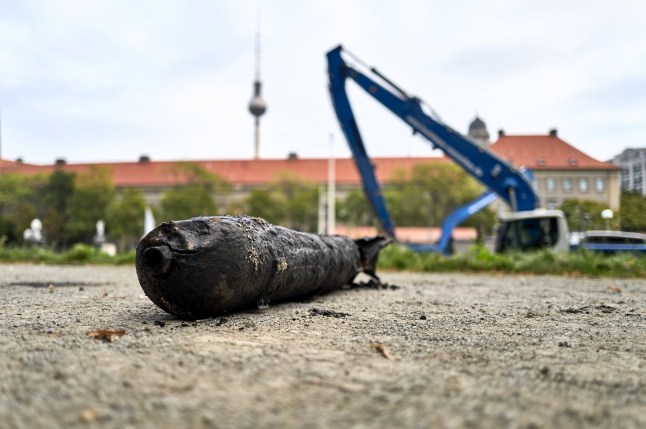 A spokesperson said: ‘The World War II bomb discovered yesterday during construction work in Berlin-Mitte was located several metres under water and mud.