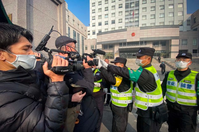 Police try to stop journalists outside a court in Shanghai from reporting on Zhang Zhan’s trial (Picture: AFP)