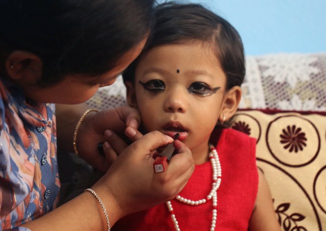 Two-year-old Aryatara Shaky is made up before her enthronement ceremony in Kathmandu (Picture: Sunil Sharma/ZUMA Press Wire/Shutterstock)
